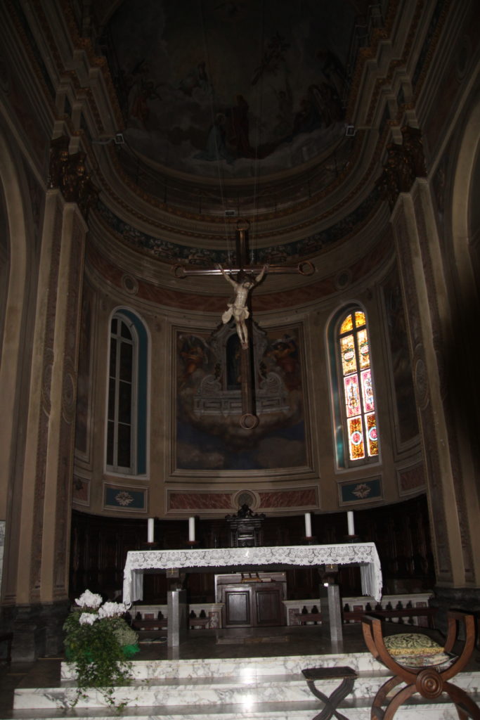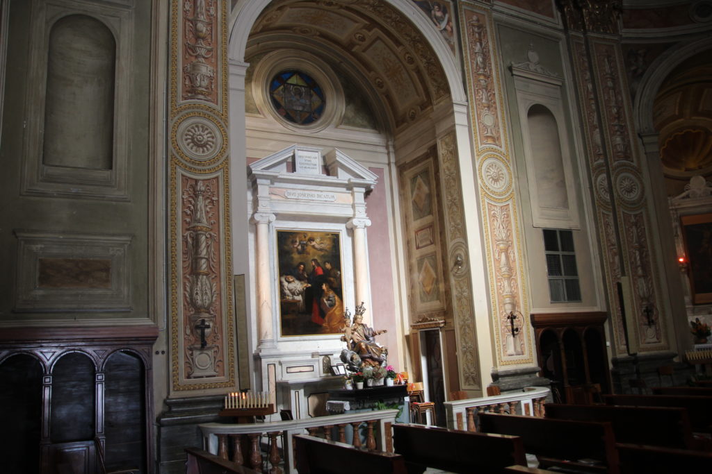 Auch hier hat der Coronavirus seine Spuren hinterlassen. In den Bänken sind die Kniebänke hochgeklappt, so dass ein Knien nicht möglich ist und auf die Sitzflächen sind mit einem X aus Klebeband gekennzeichnet. So hält das „Triviale“ Einzug in das Sakrale. Auch wenn Covid nicht trivial ist.