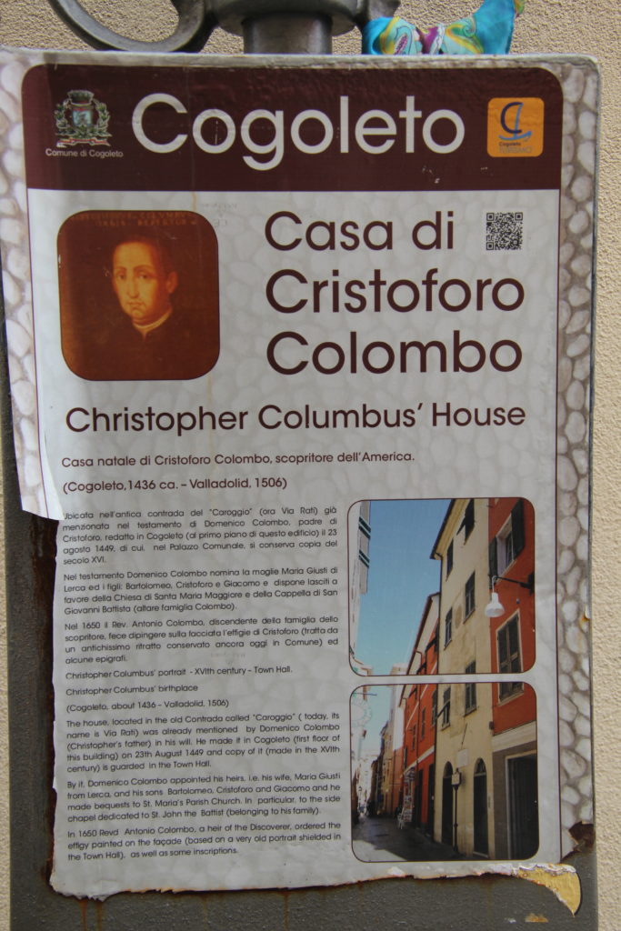 Cogoleto ist kleines Örtchen, etwa 30 Zugminuten westlich von Genuas Hauptbahnhof. Hier ist Cristoforo Colombo geboren. Sein Geburtshaus liegt im centro storico. Natürlich wird er hier als der Entdecker Amerikas verehrt. Auch wenn heute als sicher gilt, dass Leif Eriksson fast 500 Jahre früher dran war.